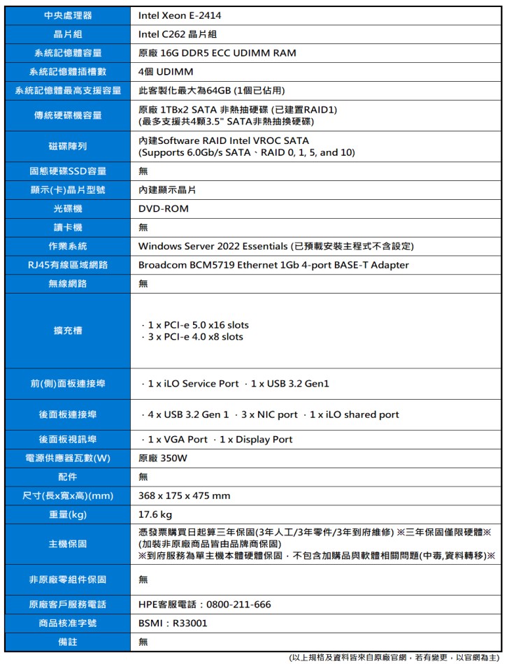產品編號:HPE ML30 Gen11 (E-2414/16G/1TBx2/350W/2022ESS)