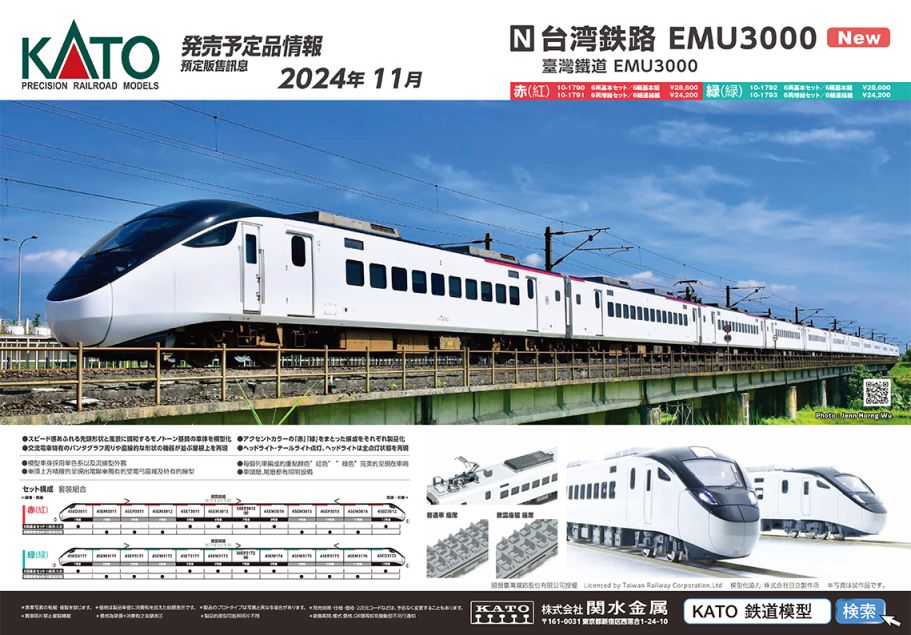 KATO 將於2024年10月發售臺灣鐵路的新型城際列車「EMU3000」的N規模型。
