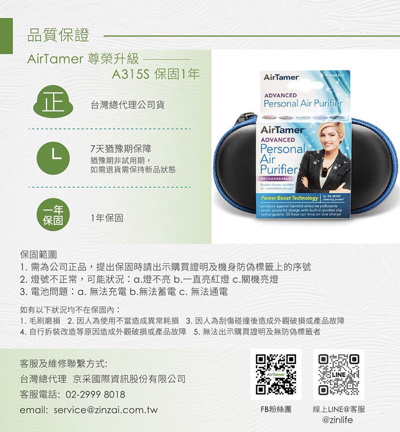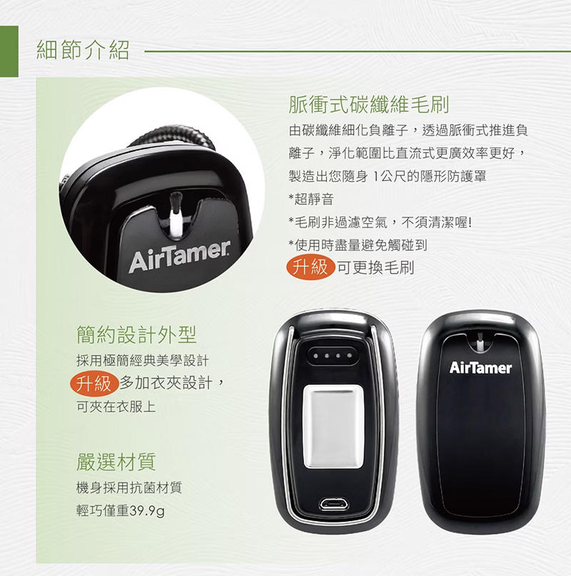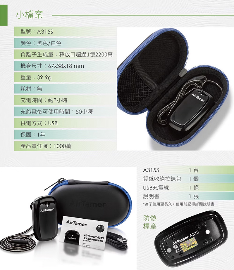 產品編號:AirTamer ATMA-A315SW 隨身負離子空氣清淨機 A315S(白)