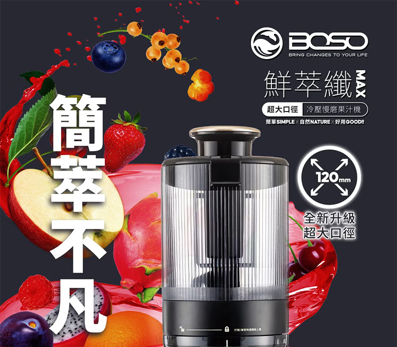 產品編號:BOSO BOHO-SJ120W 鮮萃纖Max 超大口徑冷壓慢磨果汁機