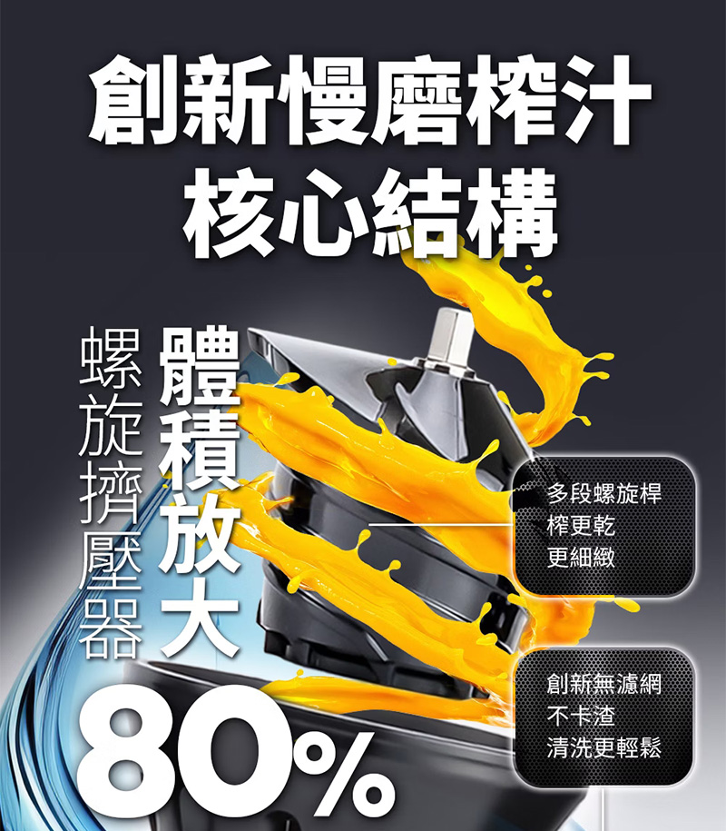 .螺旋壓榨核心結構加大80%,榨汁更有力!