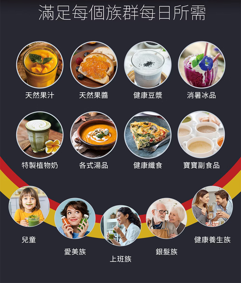 材料:機身總成、進料蓋、果汁壺:ABS/榨汁桶身、榨汁桶、螺旋擠壓器:PC