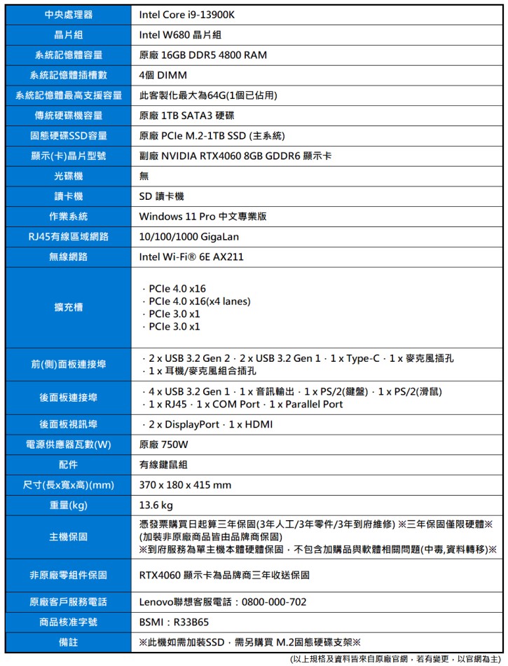 產品編號:Lenovo P3(i9-13900K/16G/M.2-1T+1TB/副廠RTX4060/750W/AX211/W11P)