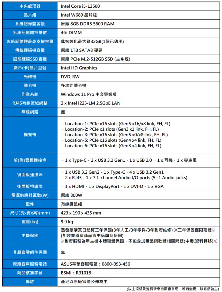 產品編號:ASUS E500G9(i5-13500/8G/M.2-512G+1TB/300W/W11P)