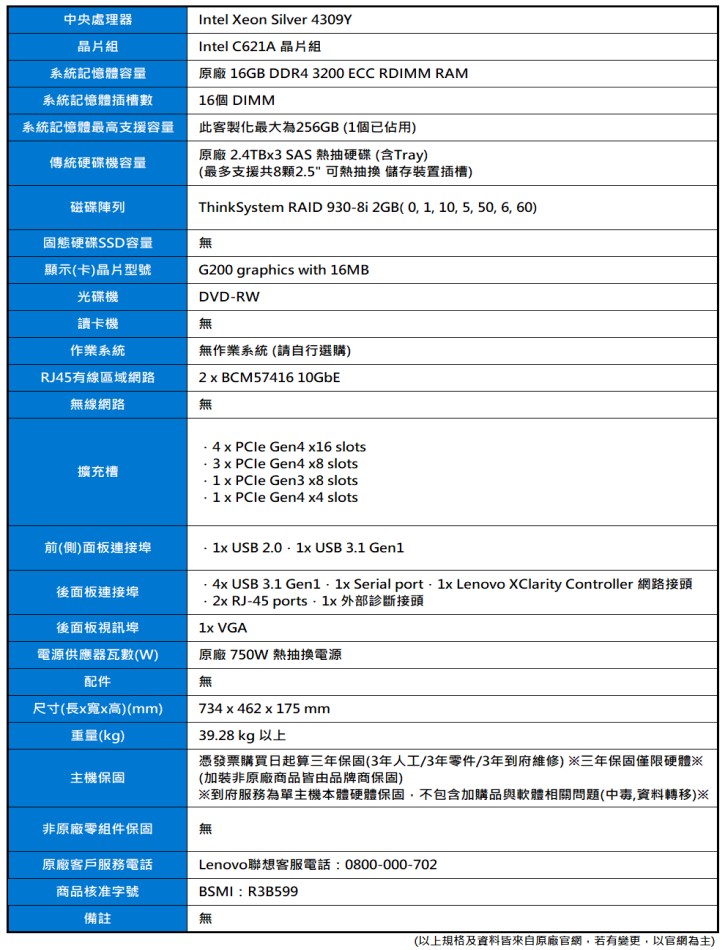 產品編號:Lenovo ST650 V2 (4309Y/16G/2.4TBx3/750W/FD)