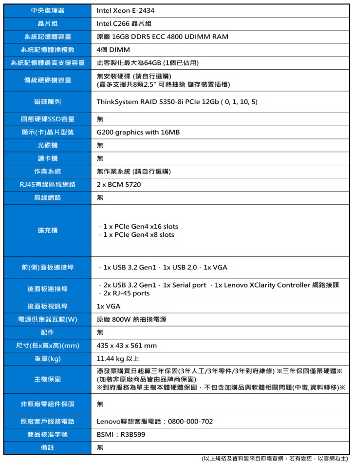 產品編號:Lenovo SR250 V3 (E2434/16G/NOHDD/800W/FD)