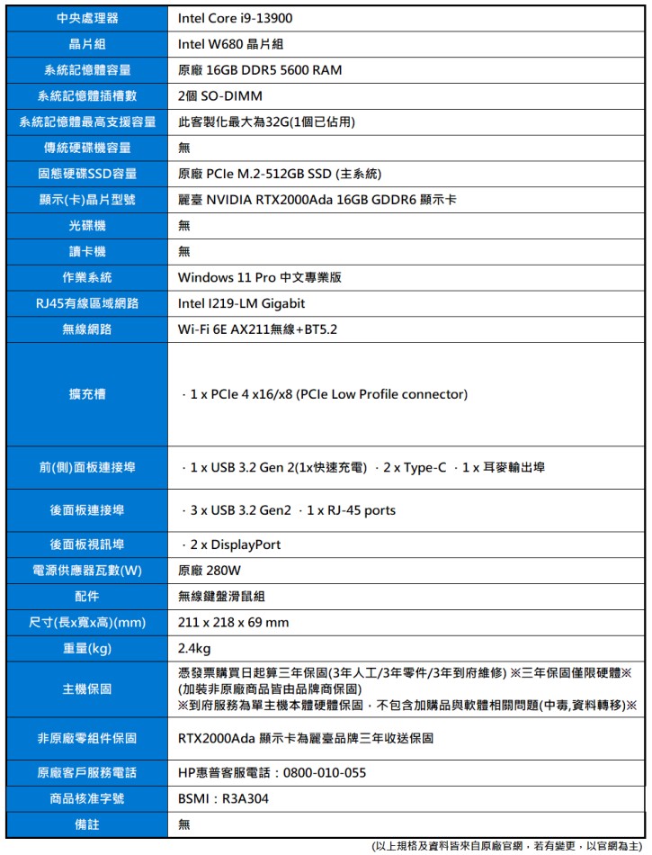 產品編號:HP Z2 Mini G9 (i9-13900/16G/M.2-512G/麗臺RTX2000Ada/280W/AX211/W11P)