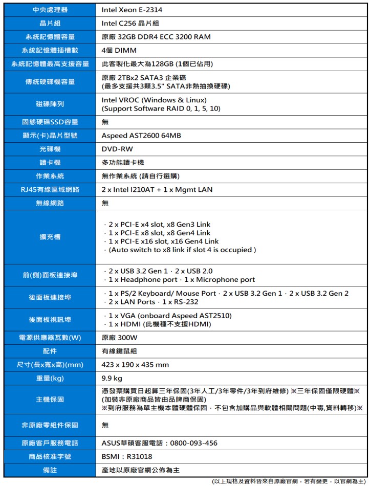 產品編號:ASUS TS100-E11 (E-2314/32G/2TBx2/300W/FD)