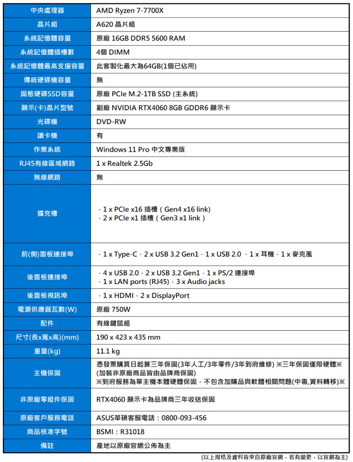 產品編號:ASUS ExpertCenter(R7-7700X/16G/M.2-1TB/副廠RTX4060/750W/W11P)