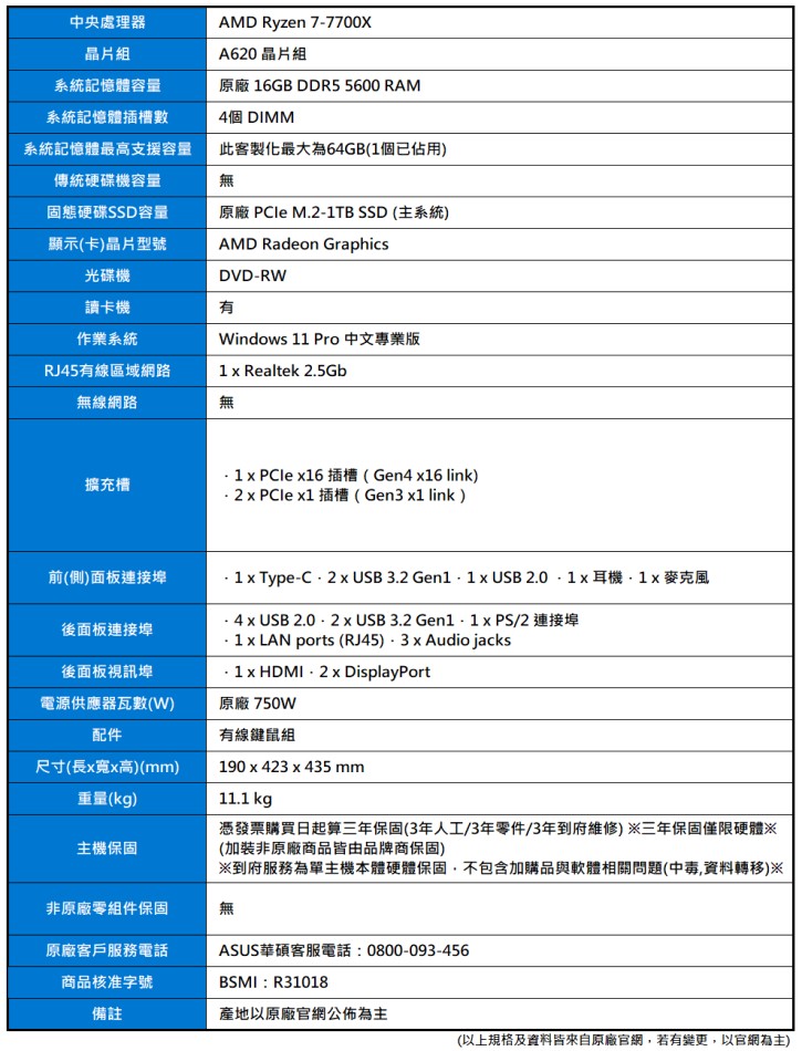 產品編號:ASUS E500A(R7-7700X/16G/M.2-1TB/750W/W11P)