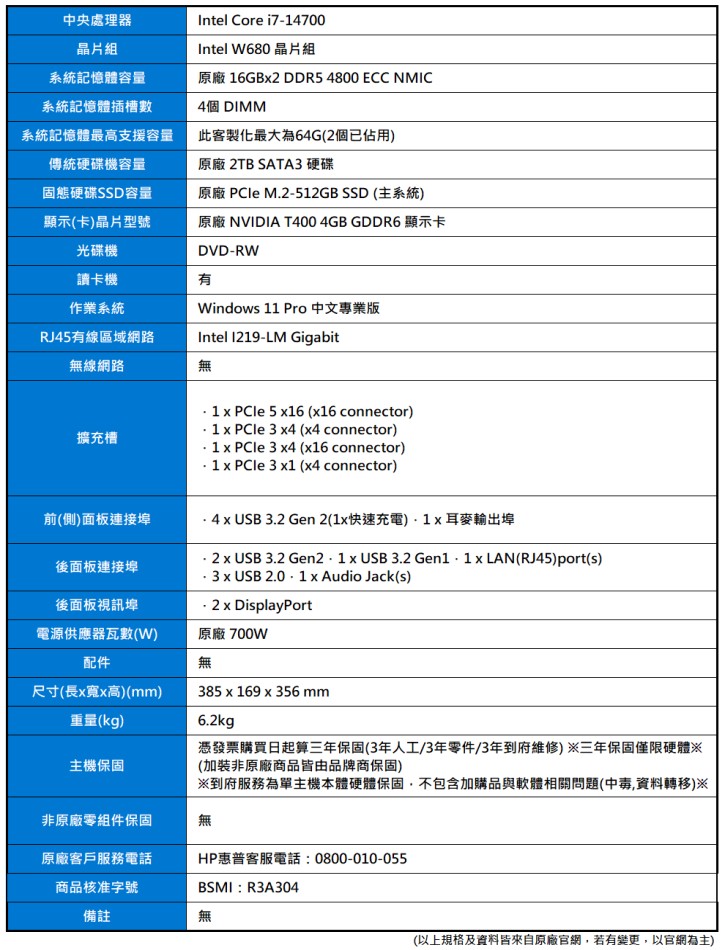 產品編號:HP Z2 G9 TWR(i7-14700/16Gx2/M.2-512G+2TB/T400/700W/W11P)