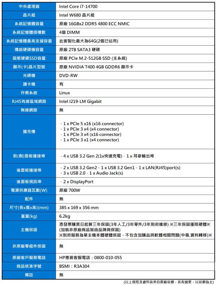產品編號:HP Z2 G9 TWR(i7-14700/16Gx2/M.2-512G+2TB/T400/700W/Linux)