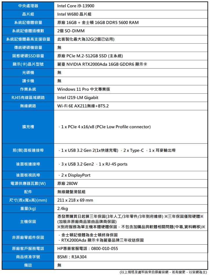 產品編號:HP Z2 Mini G9 (i9-13900/16G+金16G/M.2-512G/麗臺RTX2000Ada/280W/AX211/W11P)