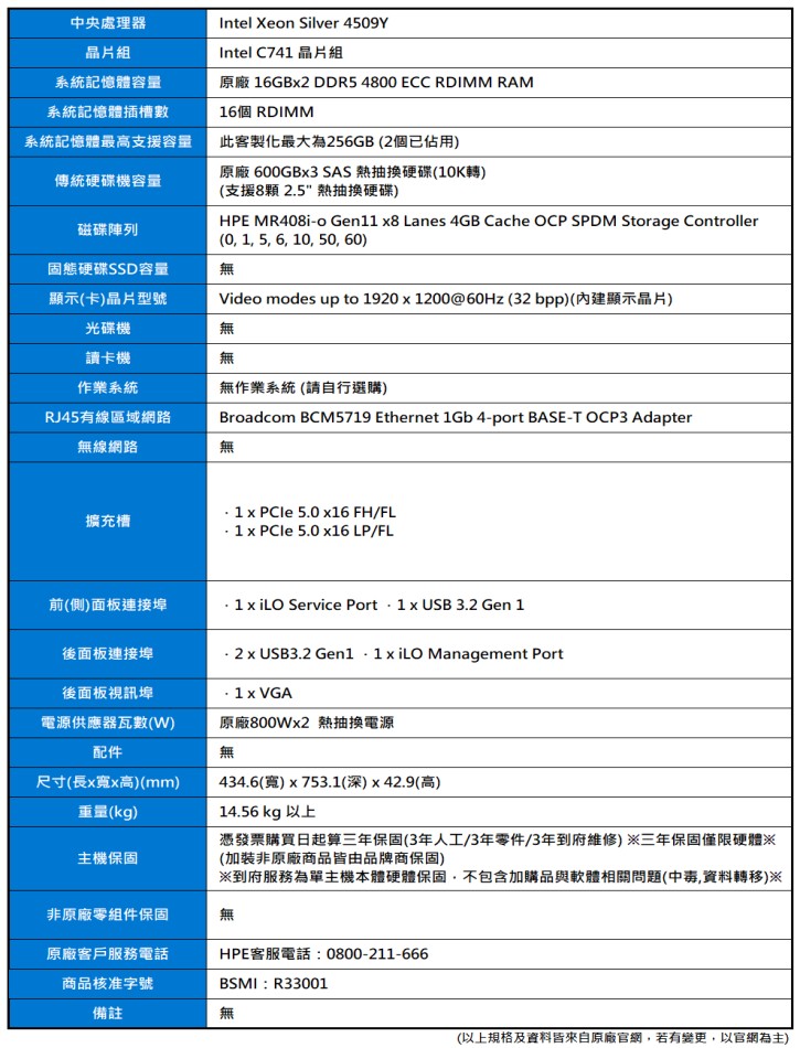 產品編號:HPE DL360 Gen11(Silver-4509Y/16Gx2/600Gx3/800Wx2/FD)