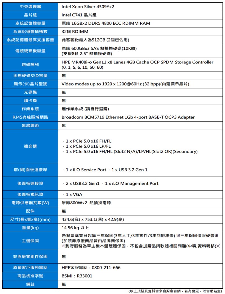 產品編號:HPE DL360 Gen11(Silver-4509Yx2/16Gx2/600Gx3/800Wx2/FD)