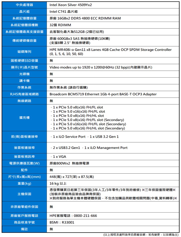 產品編號:HPE DL380 Gen11(Silver-4509Yx2/16Gx2/600Gx3/800Wx2/FD)