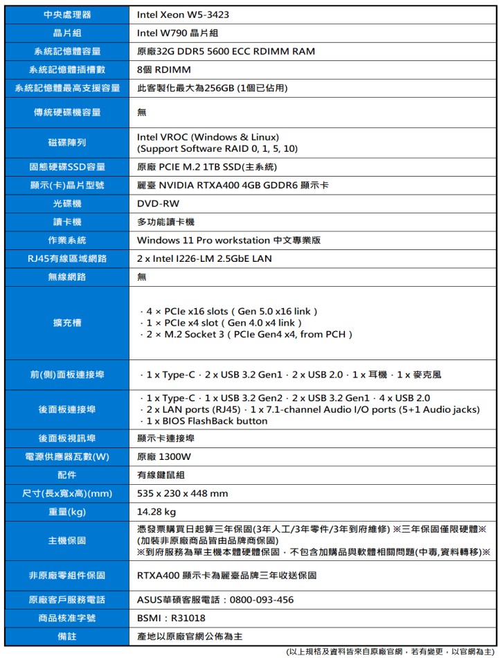 產品編號:WS890T (W5-3423/32GB/M.2-1TB/副廠RTXA400/1300W/W11PWK)