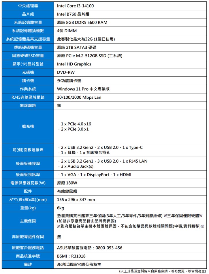 產品編號:ASUS M701MER(i3-14100/8G/M.2-512G+2TB/180W/W11P)