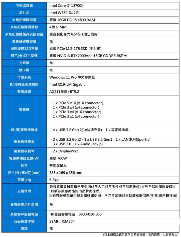 產品編號:HP Z2 G9 TWR(i7-13700K/16G/M.2-1TB/RTX2000Ada/700W/AX211/W11P)
