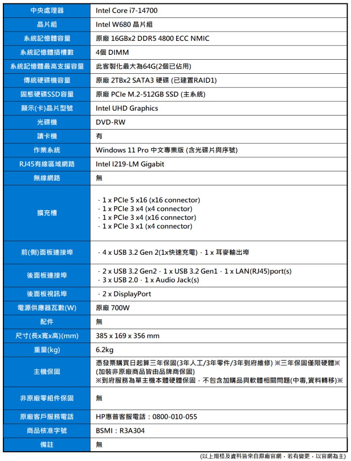 產品編號:HP Z2 G9 TWR(i7-14700/16Gx2/M.2-512G+2TBx2/700W/W11P)