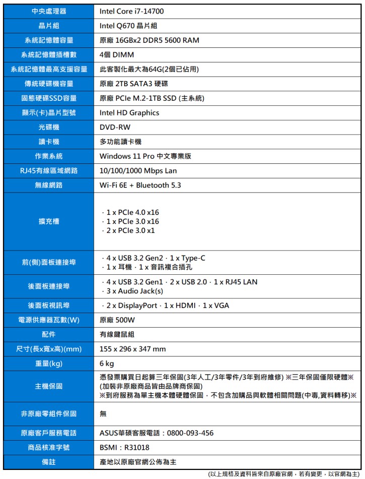 產品編號:ASUS M901MDR(i7-14700/16Gx2/M.2-1TB+2TB/500W/WIFI/W11P)