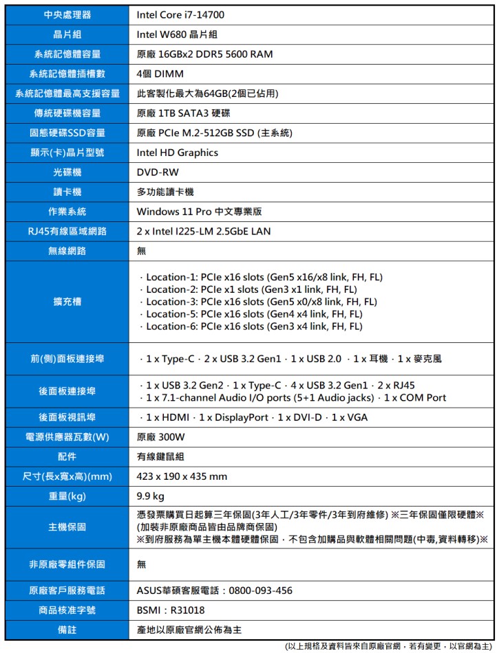 產品編號:ASUS 繪圖先鋒(i7-14700/16Gx2/M.2-512G+1TB/300W/W11P)