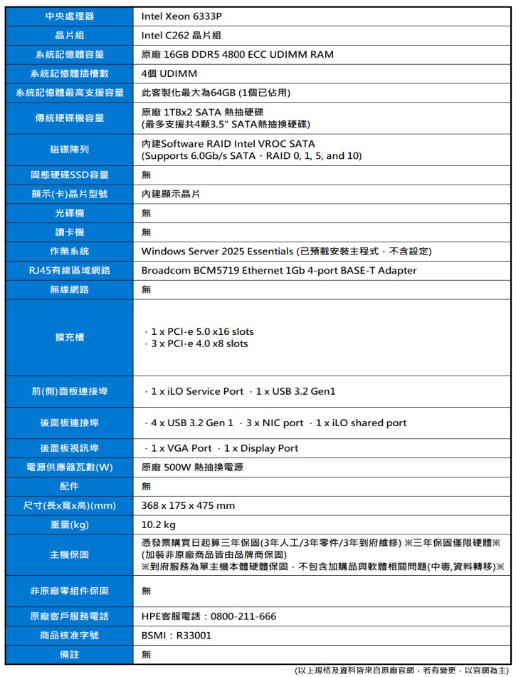 產品編號:HPE ML30 Gen11 (6333P/16G/1TBx2/500W/2025ESS)