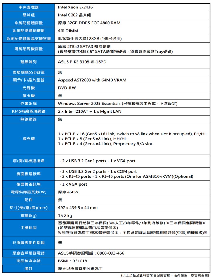 產品編號:ASUS RS300-E12(E-2436/32G/2TBx2/450W/2025ESS)