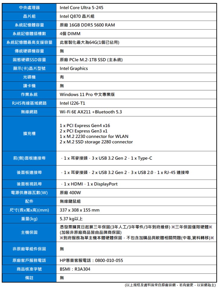 產品編號:HP ProDesk 4 G1i TWR (U5-245/16G/M.2-1TB/400W/WIFI6E/W11P)