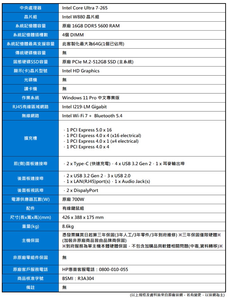 產品編號:HP Z2 G1i (U7-265/16G/M.2-512G/700W/Wifi7/W11P)