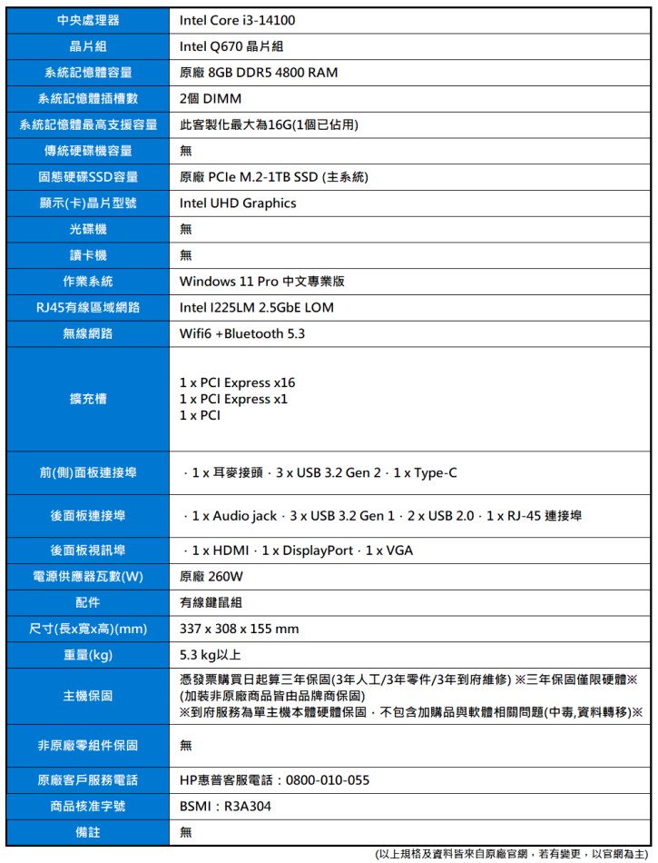 產品編號:HP 400G9 TWR (i3-14100/8G/M.2-1TB/260W/WIFI6/W11P)