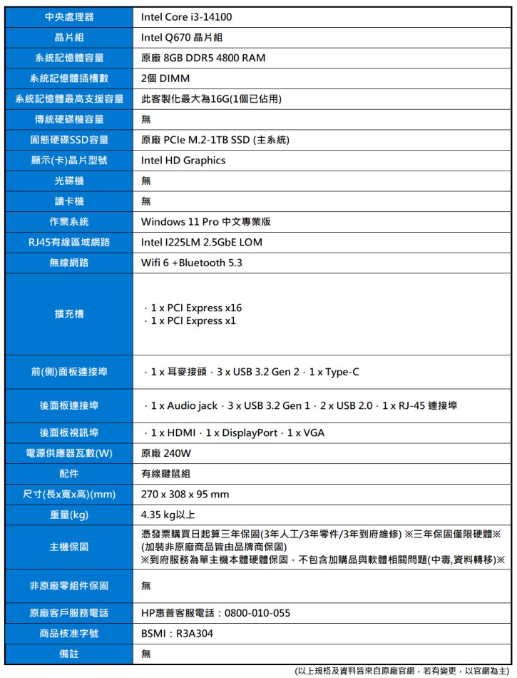 產品編號:HP 400G9 SFF (i3-14100/8G/M.2-1TB/240W/WIFI6/W11P)