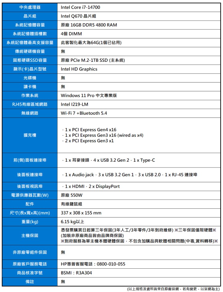 產品編號:HP 800G9 TWR (i7-14700/16G/M.2-1TB/550W/WIFI7/W11P)