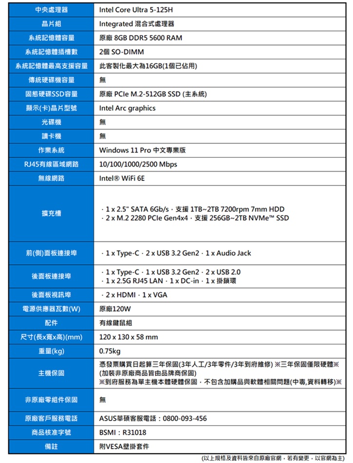 產品編號:ASUS PN65 (Ultra 5-125H/8G/M.2-512G/120W/W11P)