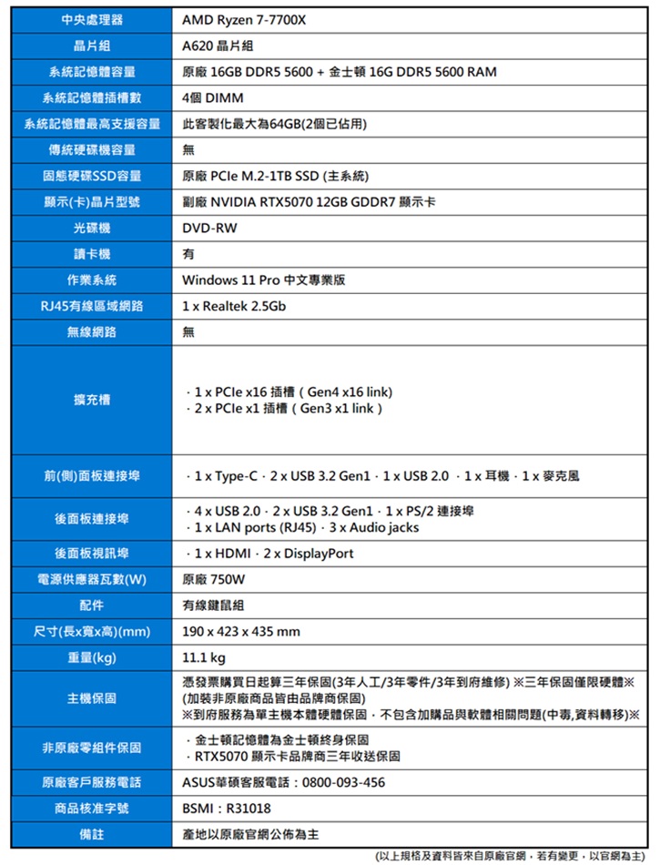 產品編號:ASUS ExpertCenter(R7-7700X/16G+金16G/M.2-1TB/副廠RTX5070/750W/W11P)