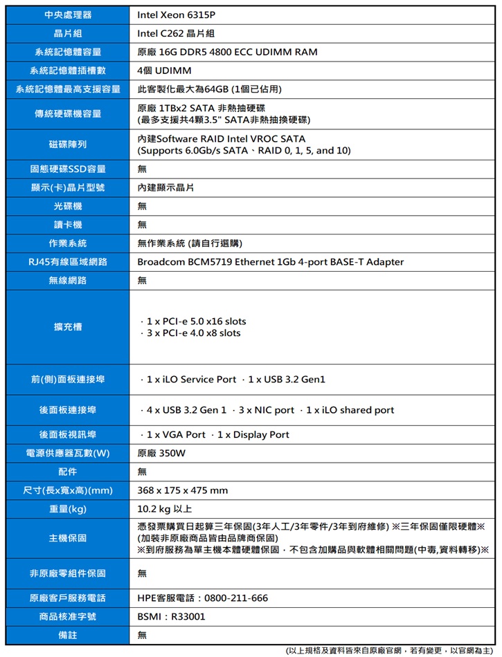 產品編號:HPE ML30 Gen11 (6315P/16G/1TBx2/350W/FD)