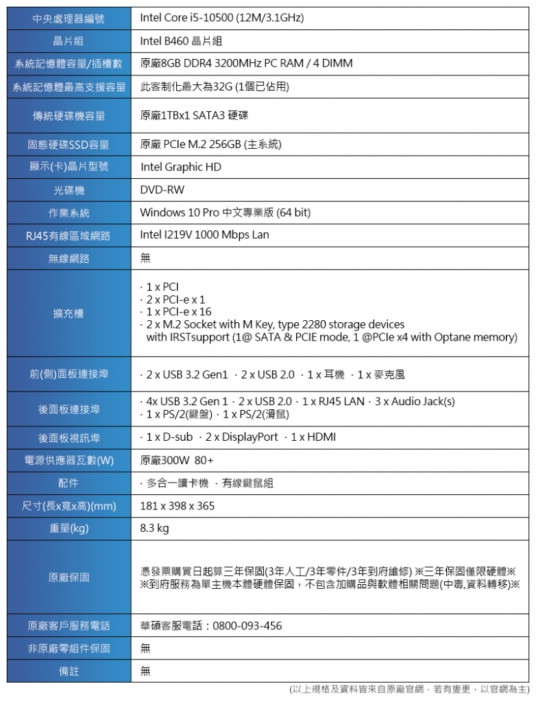 產品編號:ASUS M700TA(i5-10500/8G/M.2-256G+1TB/W10P)